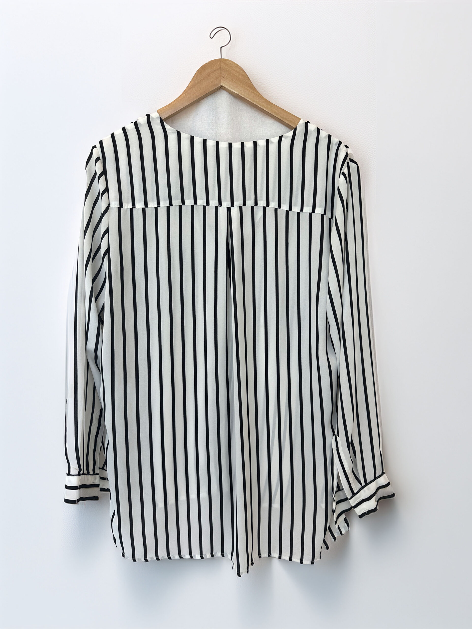 Estilo monocromático con onda urbana ⚫⚪ Esta camisa rayada en blanco y negro es ideal para quienes buscan un look moderno, elegante y fácil de combinar. Su tejido liviano aporta comodidad y movimiento.